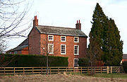 Dorfold Dairy House (SJ631518) was formerly the Dorfold Estate's home farm; a three-storey, three-bay, U-shaped building in red brick dating from the late 17th century, it is listed at grade II*.[73] The adjacent red-brick farm building is grade II listed.[74] Madam's Farm (SJ625526) off Raven's Lane was the former dower house of the Hall; a three-storey, three-bay, T-shaped building in red brick dating from the late 18th century, it is listed at grade II.[75] Other grade-II-listed buildings within the parish include the black-and-white Cuckoo Cottage (SJ625535) on Cuckoo Lane just north of Acton Grange, dating from the late 17th century, an unnamed red-brick cottage (SJ628539) by the Burford crossroads, dating from the early 19th century,[76][77] and the Old Farmhouse, Village Farm.[78] The unlisted Dorfold Cottage (SJ625530) is a Victorian house featuring a castellated tower and Gothic stucco-work on the interior.[58][79][80]