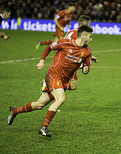 On 25 July, Liverpool confirmed that Lallana had injured his knee while training with the club in Boston, Massachusetts during pre-season and would be out for six weeks. He therefore missed the start of the league season, which began against former club Southampton.[29] He made his debut in Liverpool's fourth match on 13 September, starting and being substituted for Raheem Sterling after 61 minutes in a 1–0 home defeat to Aston Villa.[30] On 4 October he scored his first goal for the club, opening a 2–1 home win against West Bromwich Albion seconds before half time.[31] Lallana scored his second goal for Liverpool on 2 December during Liverpool's 3–1 win at Leicester City.[32] On 29 December, he continued his fine form and scored two goals in a 4–1 win against Swansea City at Anfield.[33] On 14 February, Lallana scored the winning goal in a FA Cup Fifth Round match against Crystal Palace.[34] On 19 April 2015, Lallana was selected in the Football Manager Team of the Decade at the Football League Awards.[35]