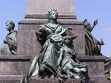 Even though the first prize was awarded to famed Cyprian Godebski, professor at the Imperial Academy of Arts in St. Petersburg from Paris, with Rygier at a close second, for the final execution a more popular design by Rygier was accepted with a contract signed in November 1889. At the poet's feet are four allegoric groups symbolising the Motherland (from the face of the monument along Sienna Street), Science (facing north), Courage (facing Sukiennice Hall) and Poetry (facing Church of St. Wojciech, south). The inscription on the pedestal reads: "To Adam Mickiewicz, the Nation".[1]
