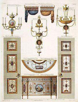 - Classical Roman decorative motifs, such as framed medallions, vases, urns and tripods, arabesque vine scrolls, sphinxes, griffins, and dancing nymphs