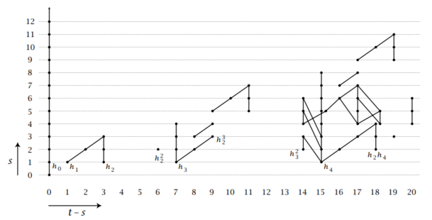 which can be expanded by computer up to degree with relative ease. Using the found generators and relations, we can calculate the -page with relative easy. Sometimes homotopy theorists like to rearrange these elements by having the horizontal index denote and the vertical index denote giving a different type of diagram for the -page[2]pg 21. See the diagram above for more information.