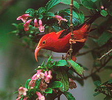 The Hawaiian honeycreepers form a large, highly morphologically diverse species group that began radiating in the early days of the Hawaiian archipelago. While today only 17 species are known to persist in Hawaii (3 more may or may not be extinct), there were more than 50 species prior to Polynesian colonization of the archipelago (between 18 and 21 species have gone extinct since the discovery of the islands by westerners). The Hawaiian honeycreepers are known for their beaks, which are specialized to satisfy a wide range of dietary needs: for example, the beak of the ʻakiapōlāʻau (Hemignathus wilsoni) is characterized by a short, sharp lower mandible for scraping bark off of trees, and the much longer, curved upper mandible is used to probe the wood underneath for insects.[10] Meanwhile, the ʻiʻiwi (Drepanis coccinea) has a very long curved beak for reaching nectar deep in Lobelia flowers.[18] An entire clade of Hawaiian honeycreepers, the tribe Psittirostrini, is composed of thick-billed, mostly seed-eating birds, like the Laysan finch (Telespiza cantans).[18] In at least some cases, similar morphologies and behaviors appear to have evolved convergently among the Hawaiian honeycreepers; for example, the short, pointed beaks of Loxops and Oreomystis evolved separately despite once forming the justification for lumping the two genera together.[20] The Hawaiian honeycreepers are believed to have descended from a single common ancestor some 15 to 20 million years ago, though estimates range as low as 3.5 million years.[21]