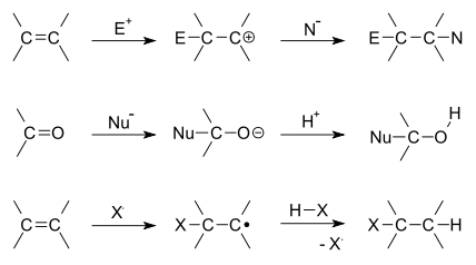 There are two main types of polar addition reactions: electrophilic addition and nucleophilic addition. Two non-polar addition reactions exist as well, called free-radical addition and cycloadditions. Addition reactions are also encountered in polymerizations and called addition polymerization.