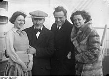 In 1927, with the rise of Adolf Hitler, Busch decided he could not in good conscience stay in Germany, so he emigrated to Basel, Switzerland. Busch was not Jewish and was popular in Germany, but firmly opposed Nazism from the beginning. On 1 April 1933, he repudiated Germany altogether and in 1938, he boycotted Italy. As the Nazis tried to convince him to return to Germany, he declared that he would "return with joy on the day that Hitler, Goebbels und Göring are publicly hanged."[3] In 1935, he became a Swiss citizen of Riehen, Basel. During 12 years in Basel and besides his many concerts around the world, he founded a chamber orchestra in Basel, was a co-founder of the Lucerne Festival in 1938, together with Arturo Toscanini and his conducting brother Fritz Busch, and taught many students in Basel, among them Yehudi Menuhin.[1] On the outbreak of World War II, Busch emigrated from Basel to the United States in 1939, where he eventually settled in Vermont. There, he was one of the founders with Rudolf Serkin of the Marlboro Music School and Festival.