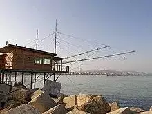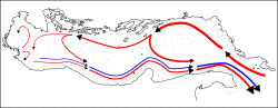 The coastal water dynamics are determined by the asymmetric coasts and the inflow of the Mediterranean seawater through the Straits of Otranto and further on along the eastern coast.[32] The smooth Italian coast (with very few protrusions and no major islands) allows the Western Adriatic Current to flow smoothly, which is composed of the relatively freshwater mass on the surface and the cold and dense water mass at the bottom.[33] The coastal currents on the opposite shore are far more complex owing to the jagged shoreline, several large islands and the proximity of the Dinaric Alps to the shore. The last produces significant temperature variations between the sea and the hinterland, which leads to the creation of local jets.[31] The tidal movement is normally slight, usually remaining below 30 centimetres (12 in). The amphidromic point is at the mid-width east of Ancona.[34]
