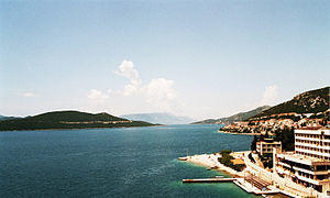 The Adriatic Sea is a semi-enclosed sea,[7] bordered in the southwest by the Apennine or Italian Peninsula, in the northwest by the Italian regions of Veneto and Friuli-Venezia Giulia, and in the northeast by Slovenia, Croatia, Bosnia and Herzegovina, Montenegro, and Albania—the Balkan peninsula. In the southeast, the Adriatic Sea connects to the Ionian Sea at the 72-kilometre (45 mi) wide Strait of Otranto.[8] The International Hydrographic Organization (IHO) defines the boundary between the Adriatic and the Ionian seas as a line running from the Butrinto River's mouth (latitude 39°44'N) in Albania to the Karagol Cape in Corfu, through this island to the Kephali Cape (these two capes are in latitude 39°45'N), and on to the Santa Maria di Leuca Cape (latitude 39°48'N).[9] It extends 800 kilometres (500 mi) from the northwest to the southeast and is 200 kilometres (120 mi) wide. It covers 138,600 square kilometres (53,500 sq mi) and has a volume of 35,000 cubic kilometres (8,400 cu mi). The Adriatic extends northwest from 40° to 45°47' north, representing the Mediterranean's northernmost portion.[8] The sea is geographically divided into the Northern Adriatic, Central (or Middle) Adriatic, and Southern Adriatic.[10]