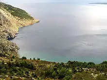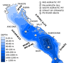 The Adriatic Sea's average depth is 259.5 metres (851 ft), and its maximum depth is 1,233 metres (4,045 ft); however, the North Adriatic basin rarely exceeds a depth of 100 metres (330 ft).[18] The North Adriatic basin, extending between Venice and Trieste towards a line connecting Ancona and Zadar, is only 15 metres (49 ft) deep at its northwestern end; it gradually deepens towards the southeast. It is the largest Mediterranean shelf and is simultaneously a dilution basin and a site of bottom water formation.[30] The Middle Adriatic basin is south of the Ancona–Zadar line, with the 270-metre (890 ft) deep Middle Adriatic Pit (also called the Pomo Depression or the Jabuka Pit). The 170-metre (560 ft) deep Palagruža Sill is south of the Middle Adriatic Pit, separating it from the 1,200-metre (3,900 ft) deep South Adriatic Pit and the Middle Adriatic basin from the South Adriatic Basin. Further on to the south, the sea floor rises to 780 metres (2,560 ft) to form the Otranto Sill at the boundary to the Ionian Sea. The South Adriatic Basin is similar in many respects to the Northern Ionian Sea, to which it is connected.[13] Transversely, the Adriatic Sea is also asymmetric: the Apennine peninsular coast is relatively smooth with very few islands and the Monte Conero and Gargano promontories as the only significant protrusions into the sea; in contrast, the Balkan peninsular coast is rugged with numerous islands, especially in Croatia. The coast's ruggedness is exacerbated by the Dinaric Alps' proximity to the coast, in contrast to the opposite (Italian) coast where the Apennine Mountains are further away from the shoreline.[31]