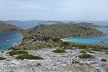 The Adriatic Sea contains more than 1,300 islands and islets, most along the Adriatic's eastern coast—especially in Croatia, with 1,246 counted.[21] The number includes islands, islets, and rocks of all sizes, including ones emerging at ebb tide only.[22] The Croatian islands include the largest—Cres and Krk, each covering about the same area of 405.78 square kilometres (156.67 sq mi)—and the tallest—Brač, whose peak reaches 780 metres (2,560 ft) above sea level. The islands of Cres and the adjacent Lošinj are separated only by a narrow navigable canal dug in the time of classical antiquity;[23] the original single island was known to the Greeks as Apsyrtides.[24] The Croatian islands include 47 permanently inhabited ones, the most populous among them being Krk, Korčula and Brač.[25] The islands along the Adriatic's western (Italian) coast are smaller and less numerous than those along the opposite coast; the best-known ones are the 117 islands on which the city of Venice is built.[26] The northern shore of the Greek island of Corfu also lies in the Adriatic Sea as defined by the IHO.[27] The IHO boundary places the Diapontia Islands (northwest of Corfu) in the Adriatic Sea.[9][28]