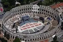 The origins of the name Adriatic are linked to the Etruscan settlement of Adria, which probably derives its name from the Illyrian adur meaning water or sea.[2] In classical antiquity, the sea was known as Mare Adriaticum (Mare Hadriaticum, also sometimes simplified to Adria) or, less frequently, as Mare Superum, "[the] upper sea".[3] The two terms were not synonymous, however. Mare Adriaticum generally corresponds to the Adriatic Sea's extent, spanning from the Gulf of Venice to the Strait of Otranto. That boundary became more consistently defined by Roman authors – early Greek sources place the boundary between the Adriatic and Ionian seas at various places ranging from adjacent to the Gulf of Venice to the southern tip of the Peloponnese, eastern shores of Sicily and western shores of Crete.[4] Mare Superum on the other hand normally encompassed both the modern Adriatic Sea and the sea off the Apennine peninsula's southern coast, as far as the Strait of Sicily.[5] Another name used in the period was Mare Dalmaticum, applied to waters off the coast of Dalmatia or Illyricum.[6]