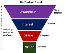 In order to penetrate markets, it is essential that high levels of awareness are created as early as possible in a product or brand life-cycle.[58] Hierarchical models provide marketers and advertisers with basic insights about the nature of the target audience, the optimal message and media strategy indicated at different junctures throughout a product's life cycle. For new products, the main advertising objective should be to create awareness with a broad cross-section of the potential market as quickly as practical. When the desired levels of awareness have been attained, the promotional effort should shift to stimulating interest, desire or conviction. The number of potential purchasers decreases as the product moves through the natural sales cycle in an effect likened to a funnel. Early in the campaign, the marketers should attempt to reach as many potential buyers as possible with high impact messages. Later in the cycle, and as the number of prospects becomes smaller, the marketer can employ more tightly targeted promotional activities such as personal selling, direct mail and email directed at those individuals or sub-segments more likely to exhibit a genuine interest in the product or brand.