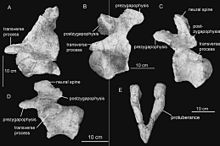 Aeolosaurs, Aeolosaurus in particular, have very distinctive caudal vertebrae. The genus Aeolosaurus is diagnosed by the shared presence of down-curved prezygapophyses on its anterior caudal vertebrae and chevrons from the anterior and middle portions of the tail with concave posterodorsal surfaces that contain double articular facets.[2] The caudal vertebrae of Aeolosaurus and the related genus Gondwanatitan share anteriorly-inclined neural spines in the anterior caudal vertebrae.[9] The vertebrae from the middle part of its tail had elongated centra.[10] Aeolosaurus had vertebral lateral fossae that resembled shallow depressions.[10] Fossae that similarly resemble shallow depressions are known from Saltasaurus, Alamosaurus, Malawisaurus, and Gondwanatitan.[10] Its middle tail vertebrae's neural spines angled anteriorly when the vertebrae are aligned.[10] These vertebrae resemble those of Cedarosaurus, Venenosaurus, and Gondwanatitan.[10] The tail of Aeolosaurus was apparently curved strongly downward, a trait likely shared with other members of Aeolosaurini.[11] This curvature would likely have led to the posterior portion of the tail being very low to the ground, though likely not touching it. The curved base of the tail may have enabled the m. caudofemoralis longus, which extended from the femur to the tail vertebrae, to exert more force while retracting the hindlimb.[11]