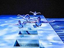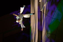 Other examples of aerial modern dance are the site-specific works of Joanna Haigood of the Zaccho Dance Theatre, Amelia Rudolph of "Project Bandaloop," and Sally Jacques' Blue Lapis Light. Haigood’s work is based on careful research of the history, architecture and societal impact of found spaces, and the translation of these memories into the movements performed in that space.[2][3] Project Bandaloop combines rock-climbing with dance in performances that scale and/or descend canyons, rock walls, and tall buildings across the world. Video of their outdoor work is sometimes integrated into indoor performances, projected onto screens or trampolines behind the dancers on stage. Blue Lapis Light uses multiple apparatuses, such as aerial silks, harnesses, and bungees to create dances on bridges, office buildings, hotels, and other outdoor spaces.