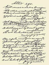 In 1873 Fet wrote to his wife: "You cannot even imagine how I hate the name Fet. I implore you never to mention it… If someone would ask me to give one single name to all the trials and tribulations of my life, I'd say without hesitation, this name is 'Fet'".[2] That same year Fet's greatest ambition was finally achieved: Tsar Alexander II granted him the return of his stepfather's surname with all the rights and privileges of the Russian nobility. Turgenev greeted with sarcasm "the disappearance of Fet and the emergence of Shenshin." More sympathetic proved to be Leo Tolstoy who praised Fet's courage and patience in bringing this painful matter to an end.[21] Now officially Shenshin, the poet retained Fet as his nom de plume.[2]