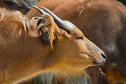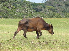The African forest buffalo (Syncerus caffer nanus), also known as the dwarf buffalo or the Congo buffalo, is the smallest subspecies of the African buffalo.[1] It is related to the Cape buffalo (Syncerus caffer caffer), the Sudan buffalo (Syncerus caffer brachyceros), and the Nile buffalo (Syncerus caffer aequinoctialis). However, it is the only subspecies that occurs mainly in the rainforests of central and western Africa with an annual rainfall around 1,500 mm.[2]