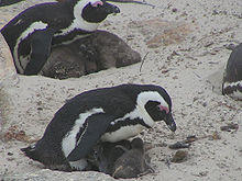 The African penguin is monogamous.[5] It breeds in colonies, and pairs return to the same site each year. The African penguin has an extended breeding season,[5] with nesting usually peaking from March to May in South Africa, and November to December in Namibia.[22] A clutch of two eggs are laid either in burrows dug in guano, or scrapes in the sand under boulders or bushes. Incubation is undertaken equally by both parents for around 40 days. At least one parent guards the chicks for about one month, whereafter the chicks join a crèche with other chicks and both parents head out to sea to forage each day.