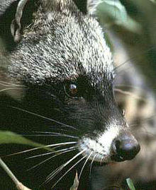 The African civet (/ˈsɪvɪt/; Civettictis civetta)[2] is a large viverrid native to sub-Saharan Africa, where it is considered common and widely distributed in woodlands and secondary forests. It is listed as Least Concern on the IUCN Red List since 2008. In some countries, it is threatened by hunting, and wild-caught individuals are kept for producing civetone for the perfume industry.[1]