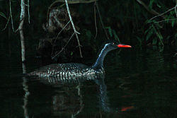The African finfoot is an underwater specialist with a long neck, a striking sharp beak, and bright red, lobed feet. The plumage varies by race, generally pale underneath and darker on top. The males are usually darker than the females. It superficially resembles South America's torrent duck.