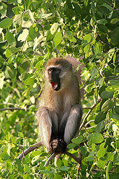 Chlorocebus monkeys live in multiple male/multiple female groups, which can be as large as 76 individuals.[2] The group hierarchy plays an important role: dominant males and females are given priority in the search for food, and are groomed by subordinate members of the group. They exhibit female philopatry, a social system whereby the females remain in the same home range where they were born, and males leave once sexually mature.[2] These monkeys are territorial animals, and a group can occupy an area of approximately .06 to 1.78 km2 (0.023 to 0.687 sq mi).[3] They use a wide variety of vocalizations.[2] They can with warn off members of other groups from their territory, and they can also warn members of their own troop of dangers from predators, using different calls for different predators.[2] Monkeys scream when they are disciplined by members of the troop. Facial expressions and body posturing serve as additional communication tools.[2] Their social interactions are highly complex. Where alliances can be formed for benefit, deception is sometimes used. Physical affection is important between family members.