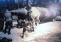 Production started in 1943 on the rocket. The missile testing ground at Blizna was quickly located by the Polish resistance movement, the Armia Krajowa, thanks to reports from local farmers. Armia Krajowa field agents even managed to obtain pieces of the fired rockets, by arriving on the scene before German patrols. In early March 1944, British Intelligence Headquarters received a report of an Armia Krajowa agent (code name: "Makary") who had covertly surveyed the Blizna railway line and observed a freight car heavily guarded by SS troops containing "an object which, though covered by a tarpaulin, bore every resemblance to a monstrous torpedo".[20] Subsequently, a plan was formed to make an attempt to capture a whole unexploded V-2 rocket and transport it to Britain. Around 20 May 1944, a relatively undamaged V-2 rocket fell on the swampy bank of the Bug River near the village of Sarnaki, and local Poles managed to hide it before German arrival. The rocket was then dismantled and smuggled across Poland.[21] In late July 1944, the Polish resistance (see Home Army and V1 and V2) secretly transported parts of the rocket out of Poland in Operation Most III (Bridge III),[22] for analysis by British intelligence.