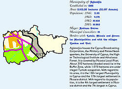 Aglandjia is near the buffer zone. It has an area of about 31 km2, of which 14 km2 are agricultural land occupied by the Turkish army since 1974. Of the remaining 17 km2, 9 km2 are national forest parks (Athalassa park, 8.6 km2 and Pedagogical Academy park 0.4 km2).