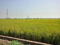 Indian irrigation infrastructure includes a network of major and minor canals from rivers, groundwater well-based systems, tanks, and other rainwater harvesting projects for agricultural activities. Of these, the groundwater system is the largest.[61] Of the 160 million hectares of cultivated land in India, about 39 million hectare can be irrigated by groundwater wells and an additional 22 million hectares by irrigation canals.[62] In 2010, only about 35% of agricultural land in India was reliably irrigated.[63] About 2/3rd cultivated land in India is dependent on monsoons.[64] The improvements in irrigation infrastructure in the last 50 years have helped India improve food security, reduce dependence on monsoons, improve agricultural productivity and create rural job opportunities. Dams used for irrigation projects have helped provide drinking water to a growing rural population, control flood and prevent drought-related damage to agriculture.[65] However, free electricity and attractive minimum support price for water intensive crops such as sugarcane and rice have encouraged ground water mining leading to groundwater depletion and poor water quality.[66] A news report in 2019 states that more than 60% of the water available for farming in India is consumed by rice and sugar, two crops that occupy 24% of the cultivable area.[67]
