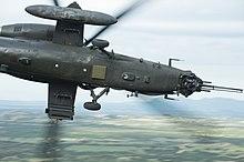 The A129 can be used in the anti-armour, armed reconnaissance, ground attack, escort, fire support and anti-aircraft roles. For the anti-ground mission the helicopter can employ various armaments, such as up to eight Hellfire missiles.[13] In the air-to-air role, the FIM-92 Stinger missile was certified for use in 2003.[14][15] The A129 can also be equipped with 81 mm or 70 mm (2.75 in) unguided rockets; a M197 three-barrel 20 mm cannon is also installed onto a nose-mounted Oto Melara TM-197B turret.[13] By 2014, the Spike-ER, a fourth-generation anti-tank missile, had been added to the A129's arsenal.[16][17]