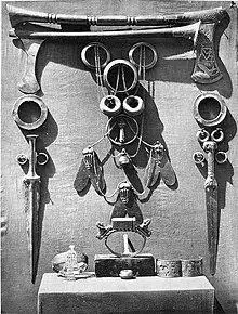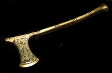 Ahhotep II was buried in Dra' Abu el-Naga' and rediscovered in 1858 by workmen employed by Auguste Mariette. The tomb contained her mummy (destroyed in 1859) and gold and silver jewelry. An inscribed ceremonial axe blade made of copper, gold, electrum and wood was decorated with a Minoan style griffin. Three golden flies were included and were awards usually given to people who served and acquitted themselves well in the army. A couple of items bore the name of Kamose, but more were inscribed with the name of Ahmose I.[4]