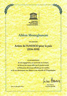 - ^ "Algerian novelist Ahlem Mosteghanemi designated UNESCO artist for peace". www.unesco.org. United Nations Educational, Scientific and Cultural Organization.