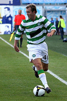 His senior debut was on 24 April 2004 aged 18 in a league game against Hearts at Tynecastle late in the 2003–04 season. He started the match and scored a goal after 17 minutes,[9] and finished that season with four league appearances as Celtic won the league.[10] He made his UEFA Champions League debut the next season in a game against Italian side AC Milan and made the breakthrough into the first-team that same season, with 27 appearances in the league as Celtic finished runners-up in Martin O'Neill's final campaign with the club. He also featured as a late substitute in the season's Scottish Cup Final in which Celtic defeated Dundee United 1–0.[11]
