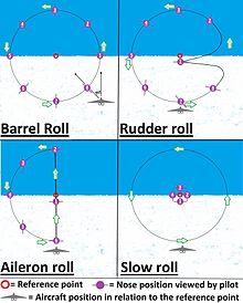 The aileron roll is an aerobatic maneuver in which an aircraft does a full 360° revolution about its longitudinal axis. When executed properly, there is no appreciable change in altitude and the aircraft exits the maneuver on the same heading as it entered. This is commonly one of the first maneuvers taught in basic aerobatics courses. The aileron roll is commonly confused with a barrel roll.