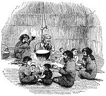 When guests were over for food, the head woman of the house would offer food and say “ipeyan” (please eat). The guest would express their gratitude, and, if it were a valuable meal such as bear meat, they would raise the food to their forehead in thanks before beginning. However, the family would not say anything before eating if there were no guests. Once finished, it was customary to say “hunna” to express their gratitude for the food.[2]:412
