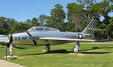 - Lockheed F-80C-10-LO, 49-0432, marked as F-80C-10-LO, 49-713A, of the 16th Fighter-Interceptor Squadron, 51st Fighter-Interceptor Wing, flown by Lt. Russell J. Brown when he downed a MiG-15 in the first all-jet air battle, 8 November 1950.[6] This airframe served with the 66th Fighter Squadron, 57th Fighter Group, before transfer to the Uruguayan Air Force in August 1958 as 218, with Grupo de Aviacion No.2, Brigada I, at Montevideo-Carrasco Airport. Returned to the USAF in 1970.[7]