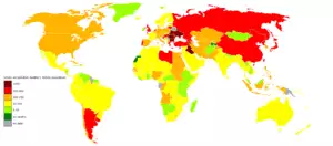 India has the highest death rate due to air pollution.[49] India also has more deaths from asthma than any other nation according to the World Health Organization. In December 2013 air pollution was estimated to kill 500,000 people in China each year.[50] There is a positive correlation between pneumonia-related deaths and air pollution from motor vehicle emissions.[51]