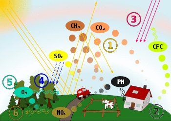 - Chlorofluorocarbons (CFCs) – harmful to the ozone layer; emitted from products are currently banned from use. These are gases which are released from air conditioners, refrigerators, aerosol sprays, etc. On release into the air, CFCs rise to the stratosphere. Here they come in contact with other gases and damage the ozone layer. This allows harmful ultraviolet rays to reach the earth's surface. This can lead to skin cancer, eye disease and can even cause damage to plants.