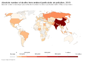 The World Health Organization estimated in 2014 that every year air pollution causes the premature death of some 7 million people worldwide.[1] Studies published in March 2019 indicated that the number may be around 8.8 million.[48]