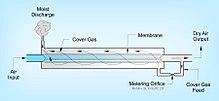 Membrane dryer refers to a dehumidification membrane that removes water vapor from compressed air. Membrane dryers operate on the principle of migration. The compressed air to be dried is passed over a membrane that has a high affinity for water vapor. The water vapor builds on the membrane and migrates through to the opposite or low pressure, side. A dry cover gas is flowed across the low pressure side and absorbs the water on the membrane. After absorbing the water, the cover gas is discharged to the atmosphere. The cover gas is generally taken from the output of the dryer. The membrane is typically a series of small tubes collected in a bundle within an outer housing.