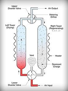 Desiccant dryers, sometimes referred to as absorption dryers, operate by absorbing water vapor into a porous media with a high affinity for water.[9][10] These types of dryers are also referred to as absorption systems or getters. Because these dryers get and hold the water, they are minimally effective as a first stage dryer. If a desiccant is used in this role, the media quickly becomes saturated and the effectiveness of the dryer is negated. Desiccant dryers are best applied in a second stage or polishing role. They are usually used down-stream from a refrigerated dryer or some other primary dryer. When applied as a second stage dryer, they can easily and reliably produce dew points in the sub zero range.