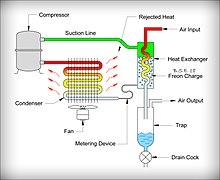 These dryers derive their cooling from a closed cycle refrigeration system based around one of three commercial refrigerants, R-22, R-134a or R410a. The refrigeration system these dryers use is similar to home and commercial air conditioning systems. The schematic shown to the right illustrates a typical Freon-based refrigerated compressed air dryer.