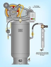 JT type dryers are units that utilize the compressed air stream as their refrigeration element. High pressure compressed air (150~175 PSI) is fed into a pressure reducing valve on top of the dryer. The output of this valve (90–120 PSI) is directed into an expansion chamber which is surrounded with porous walls. As the air expands to a lower pressure, it becomes cold (based on the Joule-Thomson Effect) and its ability to retain moisture is reduced. The moisture is released from the air in the form of fog. The fog laden air then passes through the porous walls of the chamber. The micro-droplets of water that make up the fog wet to the porous material and collect until they form droplets that can be affected by gravity. The water then drops into a trap and the dried air travels up to and out of the discharge port. The drawback of the JT Dryer is that it can only be used with two-stage compressors. This is because a two-stage compressor derives its efficiency by pumping to a high pressure (150–175 PSI.) This pressure is inappropriate for the shop floor and must be dropped to (90–120 PSI.) The JT Dryer takes advantage of this pressure drop to remove moisture from the compressed air stream through the inherent refrigeration based on the Joule-Thompson effect of the expanding air. Leveraging this pressure drop allows a JT dryer to produce the same relative dew points that Freon-based dryers produce.