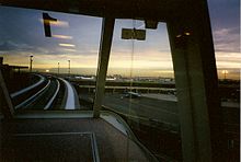 The monorail opened in 1996 and initially served only as an airport circulator, a service which allows passengers to transfer between airport terminals or concourses.[2][3] The monorail track was refurbished and extended to the NEC, with construction beginning in 1997. The system reopened for service on October 21, 2000.[4] When first opened in 1996 a fleet of 12 six-car Bombardier trains ran on the network. It has expanded to 18 six-car trains.[5]