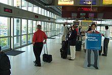 The AirTrain has three major stations within the airport, one for each main terminal (A, B, and C). These stations sit on top of the terminal buildings. There are three other stations (P2, P3, and P4) for the parking lots and rental car facilities plus a seventh (RaiLink station) at the Northeast Corridor. Automated announcements recorded by traffic reporter Bernie Wagenblast tell riders which airlines can be found in each terminal, as well as connections at other stations. In 2007, the average daily paid ridership was 4,930.[21]