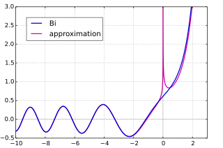 A more accurate formula for Ai(z) and a formula for Bi(z) when π/3 < |arg(z)| < π or, equivalently, for Ai(−z) and Bi(−z) when |arg(z)| < 2π/3 but not zero, are:[2][3]