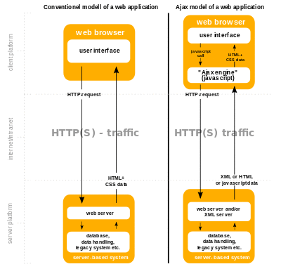 Ajax (also AJAX /ˈeɪdʒæks/; short for "Asynchronous JavaScript and XML")[1][2] is a set of web development techniques using many web technologies on the client-side to create asynchronous web applications. With Ajax, web applications can send and retrieve data from a server asynchronously (in the background) without interfering with the display and behaviour of the existing page. By decoupling the data interchange layer from the presentation layer, Ajax allows web pages and, by extension, web applications, to change content dynamically without the need to reload the entire page.[3] In practice, modern implementations commonly utilize JSON instead of XML.