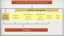 In Jainism, there are five categories which ajīva can be placed into.[2] Out of these, four categories, Dharma (medium of motion), Adharma (medium of rest), Akasha (space) and Pudgala (matter) are described as the asti-kaya dravya's (substances which possess constituent parts extending in space) while the fifth category Kala is an anasti-kaya dravya (which has no extension in space).[3]