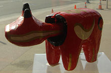 In the same period, Japan suffered a smallpox outbreak. People in Aizu noticed that children who owned akabeko toys did not seem to catch the illness.[2] The akabeko's red colour may have enhanced this association, since red amulets are thought to protect against that illness.[3][4] Akabeko toys became very popular as charms to ward off sickness, a superstition that persists in modern times. The toy has since become one of the few crafts from Fukushima Prefecture to be known all over Japan[2] and a symbol of the Aizu area.[5]