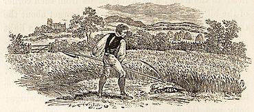 - A scene in which the grandfather as a young man is reaping, and weeps when he accidentally crushes a bird's egg, is derived from a Thomas Bewick tail-piece (pictured) in his History of British Birds. This is a homage to the oral historian George Ewart Evans of Blaxhall, a village near to Charsfield, who used the Bewick image on the title page of his first Blaxhall study Ask the Fellows Who Cut The Hay (Faber and Faber, London 1956).