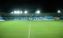 There are four stands in two tiers built as a continual whole and a capacity of 11,167. Prior to 1999, the lower tiers along the short sides had terraces, allowing an initial capacity of 13,308. There are 13 entrances, 52 toilets and 9 kiosks.[24] The stadium has thirteen executive boxes in the north stand, varying in size between 18 to 33 square metres (190 to 360 sq ft).[25] The arena is 17,250 square metres (185,700 sq ft), measuring 150 by 115 metres (492 by 377 ft).[24] It includes a restaurant and café,[26] in addition to a medical clinic.[27] The pitch is 105 by 68 metres (344 by 223 ft) of natural grass, with 4% artificial turf sown in.[24] Floodlight is provided with 176 lamps, mounted at a low 19.5 metres (64 ft). The speaker system has 32 kW.[28]