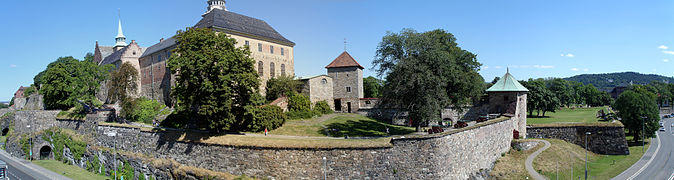 Akershus Fortress (Norwegian: Akershus Festning) or Akershus Castle (Norwegian: Akershus slott) is a medieval castle in the Norwegian capital Oslo that was built to protect and provide a royal residence for the city. Since the Middle Ages the fortress has been the namesake and centre of the main fief and later main county of Akershus, which was originally one of Norway's four main regions and which included most of Eastern Norway. The fortress itself was located within the Akershus main county until 1919, and also within the smaller Akershus sub county until 1842.