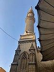 Following the beheading of Hussain ibn Ali in Iraq during the Battle of Karbala, in 1153 his head was sent to Cairo, Egypt to be protected by building a mausoleum for it completed in 1154.[2] Of this original Fatimid architectural structure, only the lower part of the south side gate called Bab Al-Akhdar remains original in the mosque today.[1] A couple years later, a minaret was added to the original Fatimid gateway by Ayyubid Salih Nagm al-Din in 1237.[1] The minaret has panel carvings of overlapping lines that create patterns called arabesque popular in Islamic Architecture.[1] The different minarets among this mosque play a role in portraying the various powers that ruled Cairo and the way they laminated their power through architecture.[3] Finally in 1874, Isma'il Pasha (Khedive Isma'il) reconstructed Al-Hussein mosque inspired by the Gothic Revival Architecture.[4] Wanting to modernize Cairo, Isma'il Pasha created a mosque with Italian Gothic style and Ottoman style minarets.[1] This mixture of various architectural styles famous is Islamic architecture during the khedival time period is called Islamic eclecticism.[1]