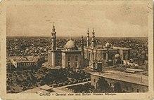 The Al-Rifa'i Mosque was constructed in two phases over the period between 1869 and 1912 when it was finally completed.[1] It was originally commissioned by Hoshiyar Qadin, the mother of the 19th century Khedive Isma'il Pasha to expand and replace the preexisting zawiya (shrine) of the medieval Islamic saint Ahmed al-Rifa'i. The zawiya was a pilgrimage site for locals who believed that the tomb had mystical healing properties. Hoshiyar envisioned a dual purpose for the new structure as a house for local traditional Sufi relics and also a mausoleum for the royal family of Egypt. Over the course of its construction the architects, design, and purpose were changed.